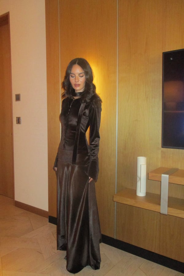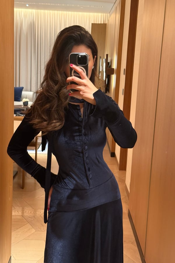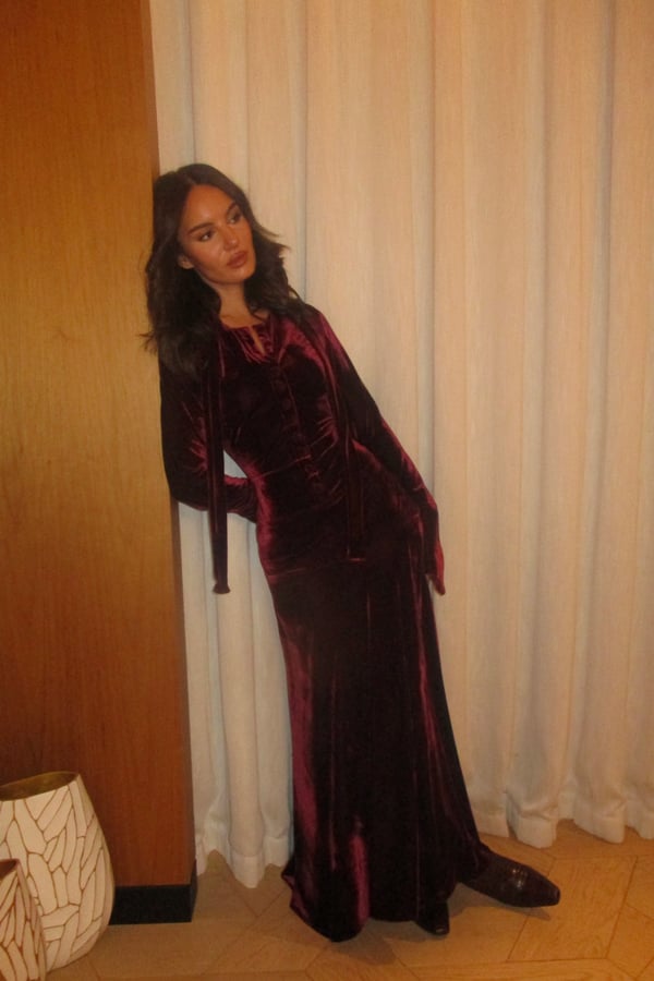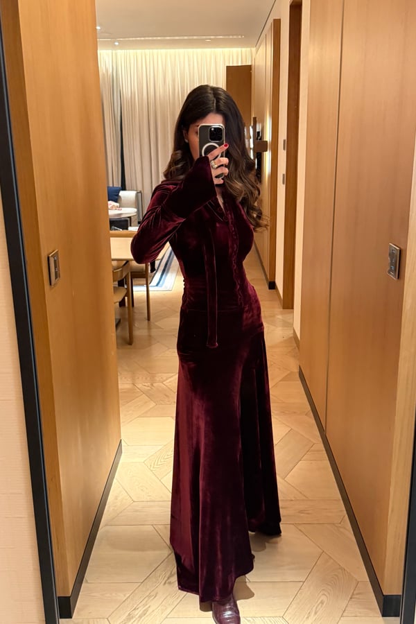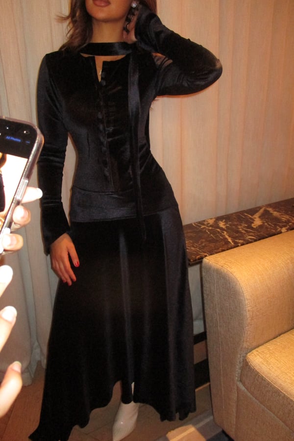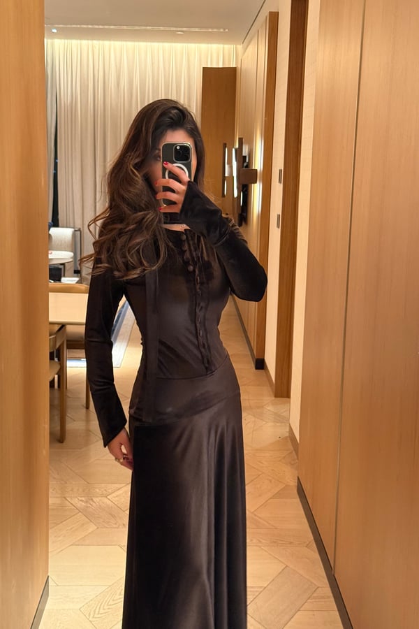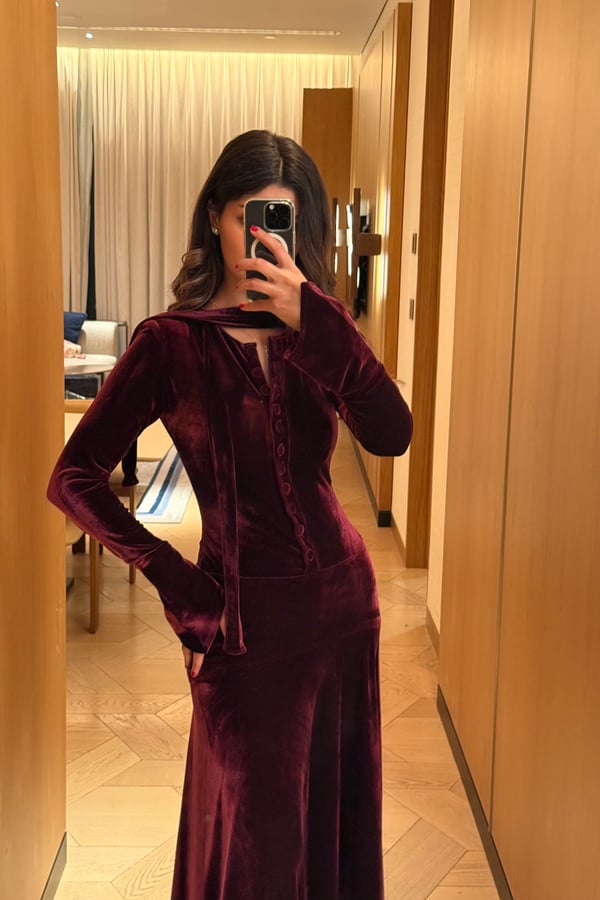 A refined velvet kaftan designed with a sculpted waist and a soft, flowing skirt. Elegant long sleeves and subtle neckline details pre order no return