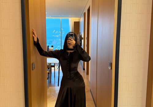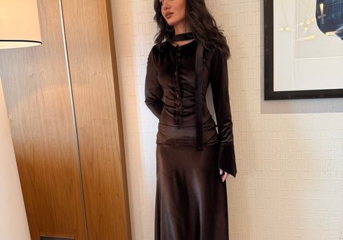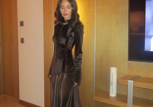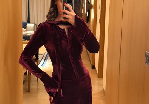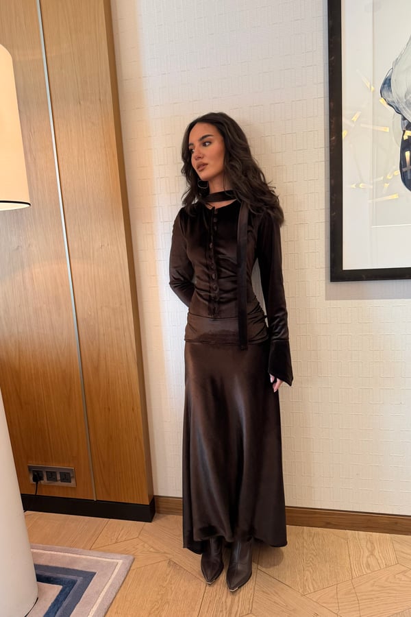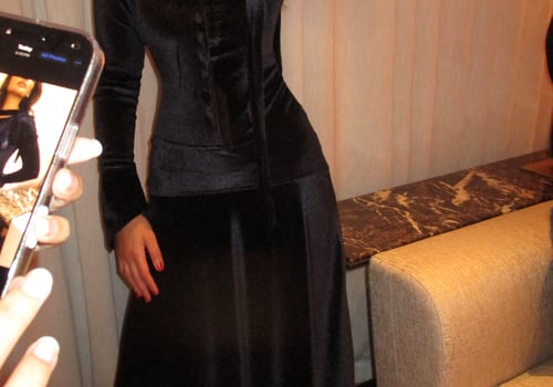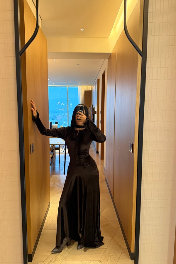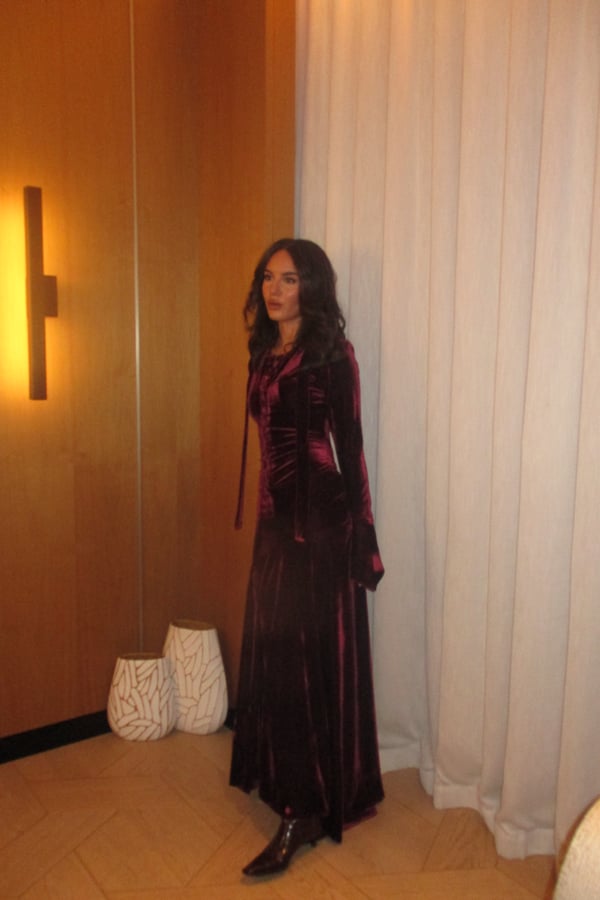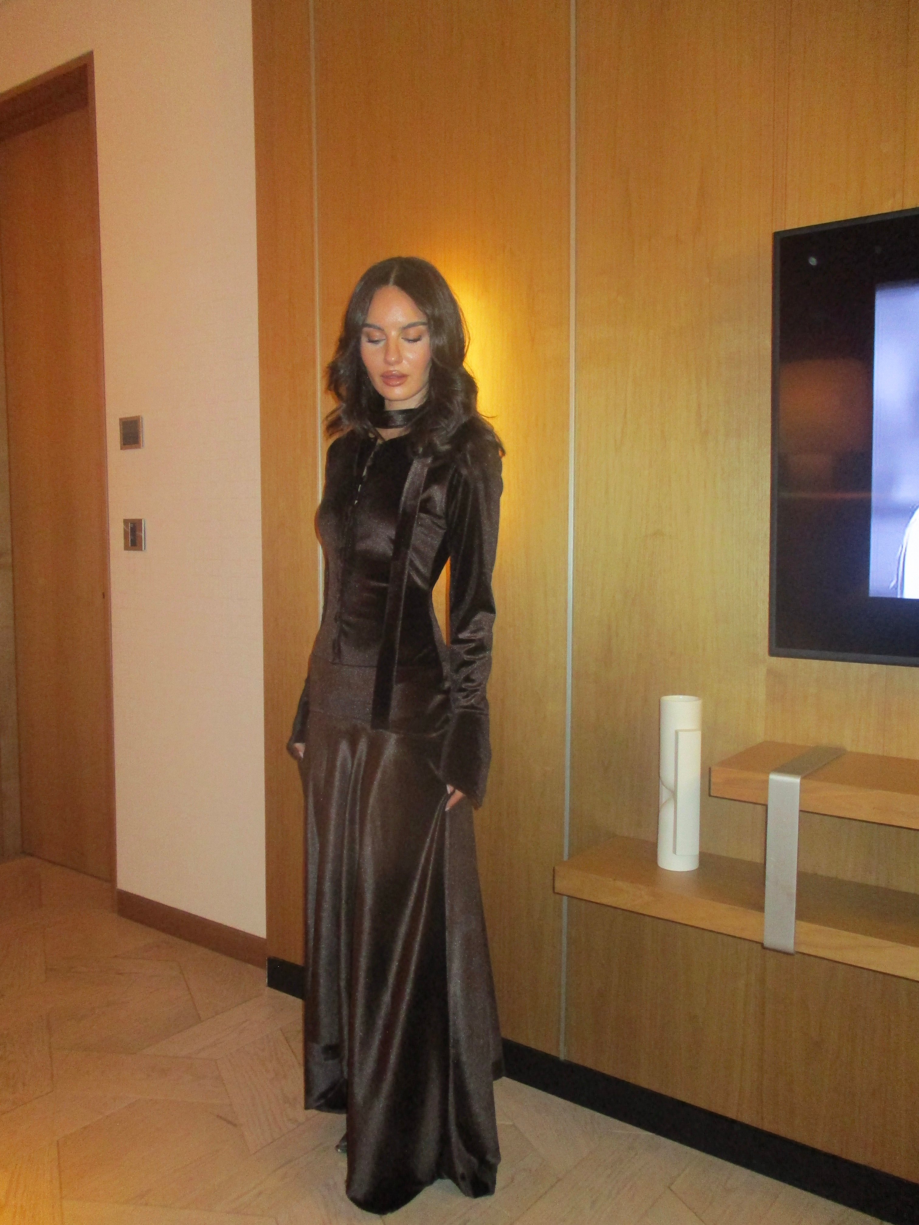 A refined velvet kaftan designed with a sculpted waist and a soft, flowing skirt. Elegant long sleeves and subtle neckline details pre order no return
