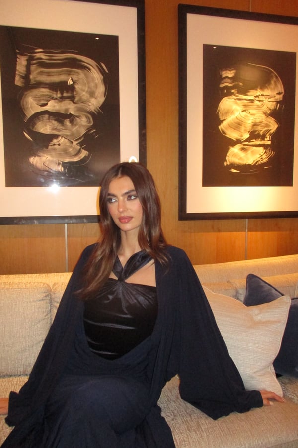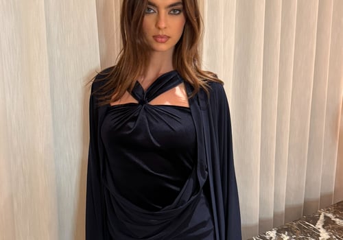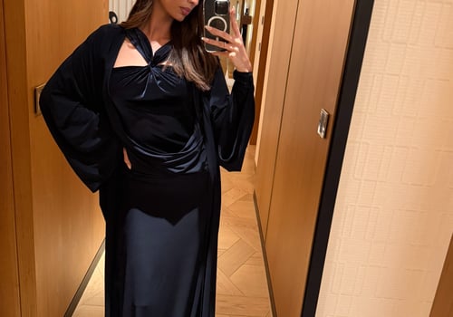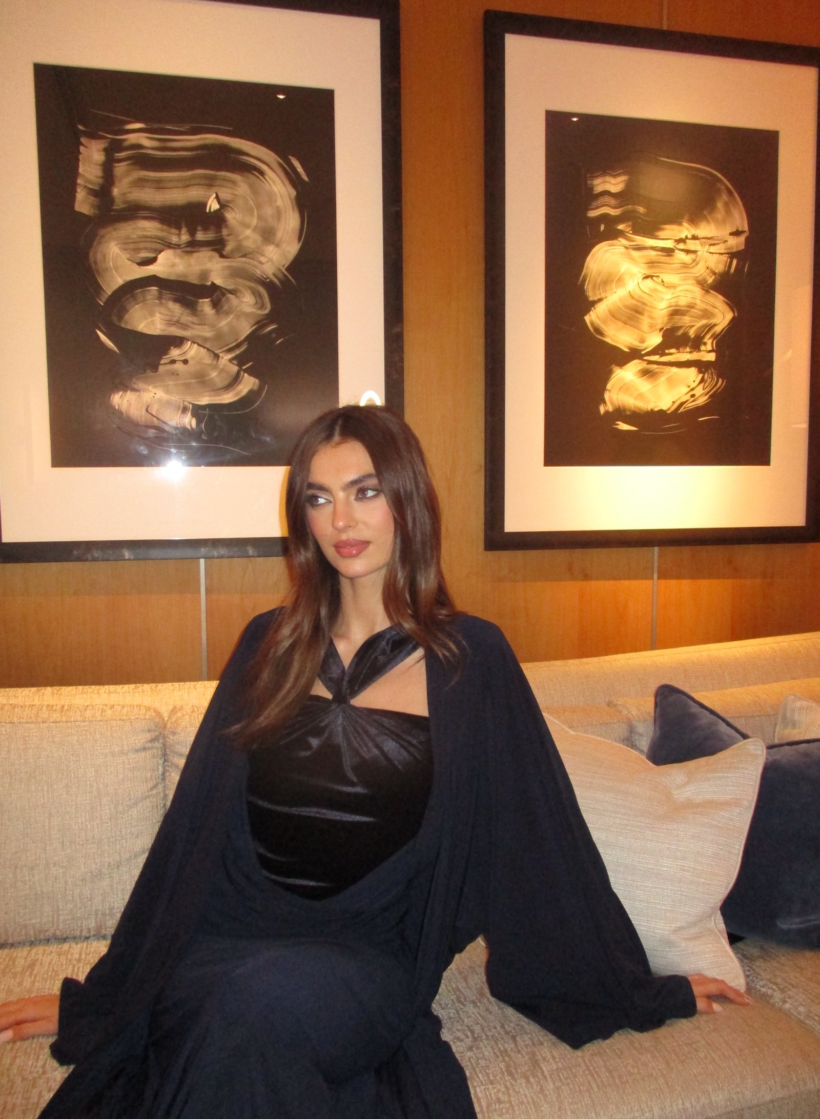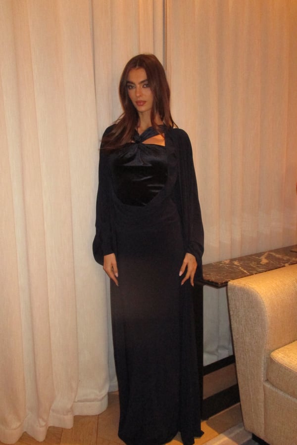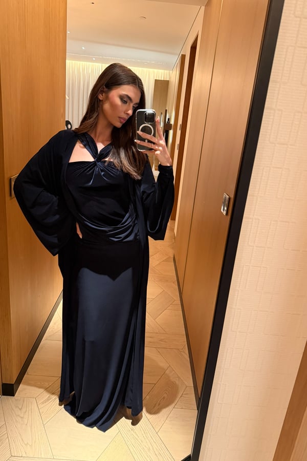 A refined two-piece set featuring a fitted dress with soft draping and a twisted neckline detail, paired with a flowing bisht that adds elegant coverage. pre order no return