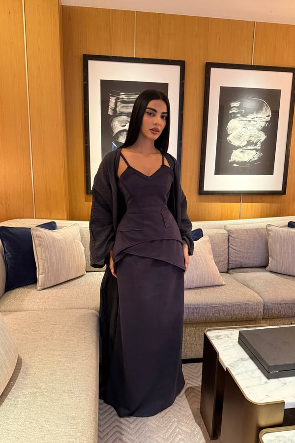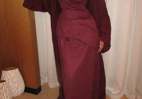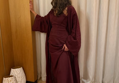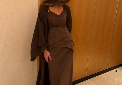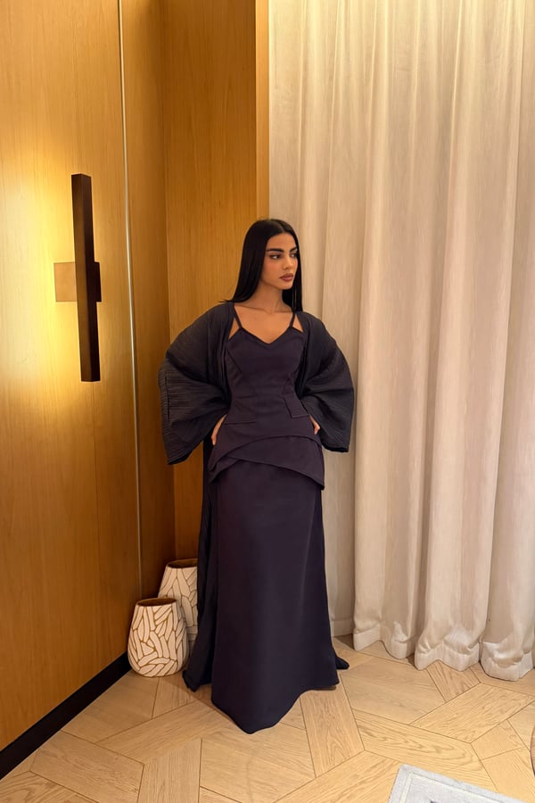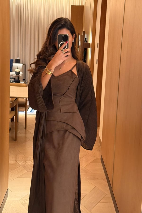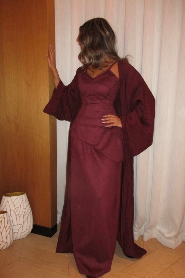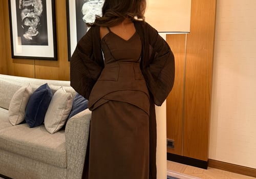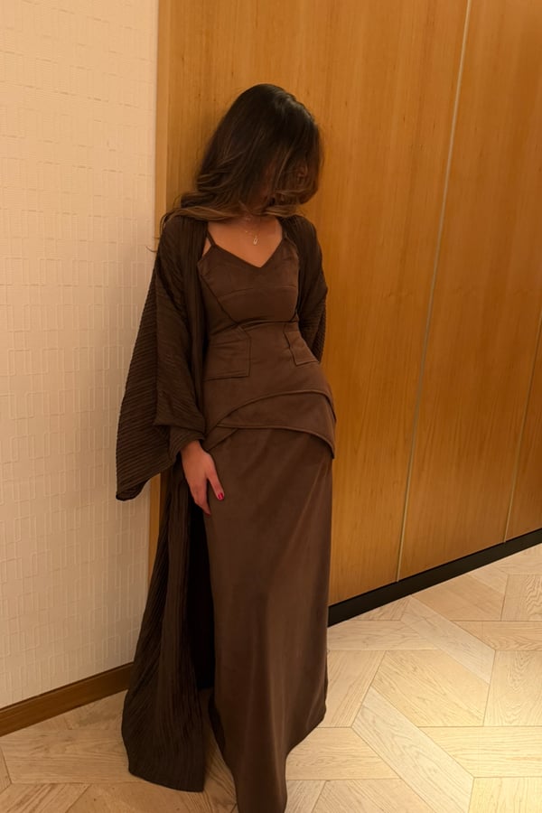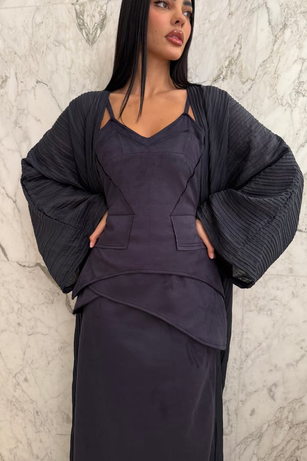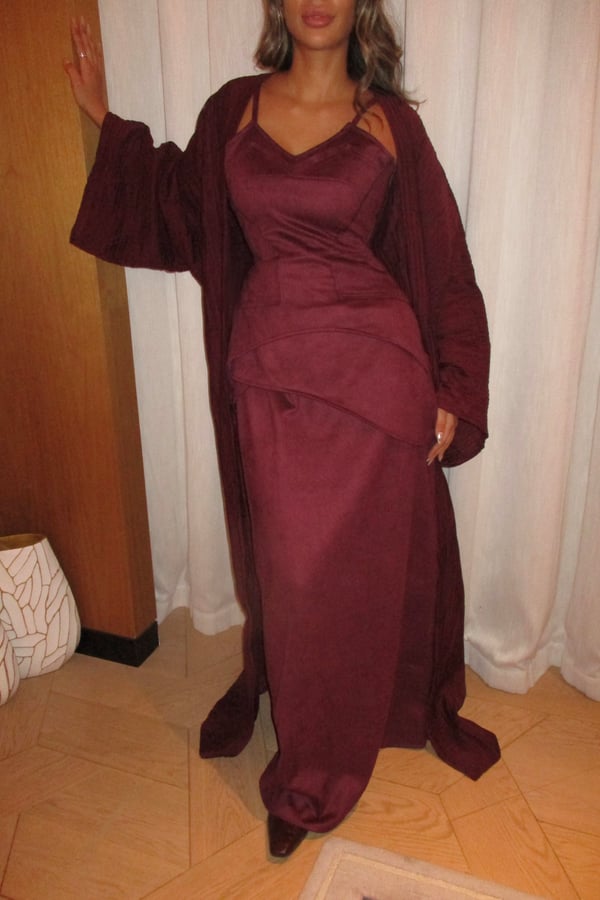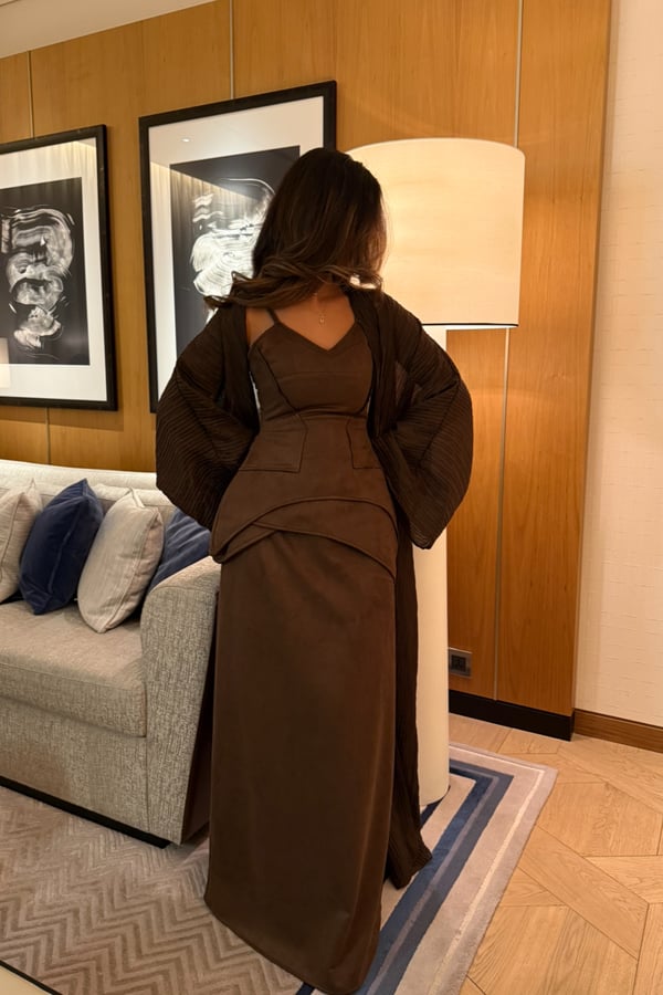 A luxurious three-piece set crafted from soft suede, featuring a structured top and straight skirt paired with a matching bisht. Designed to flatter the silhouette while offering effortless elegance, the lightweight bisht adds movement and a refined finish. pre order no return