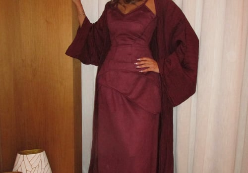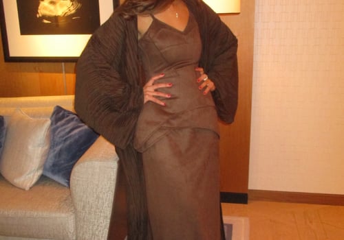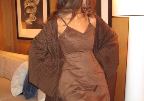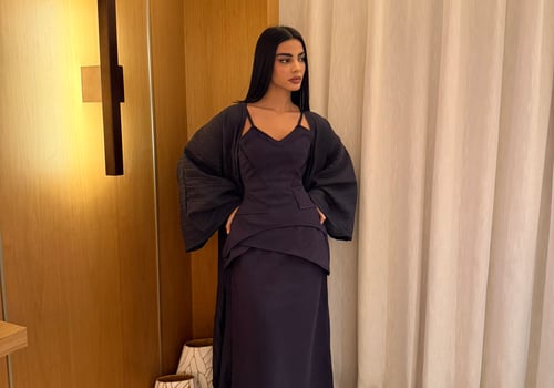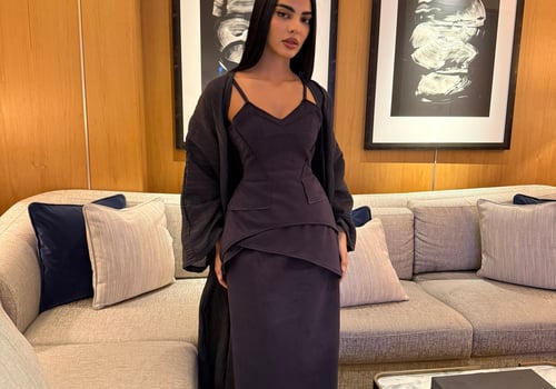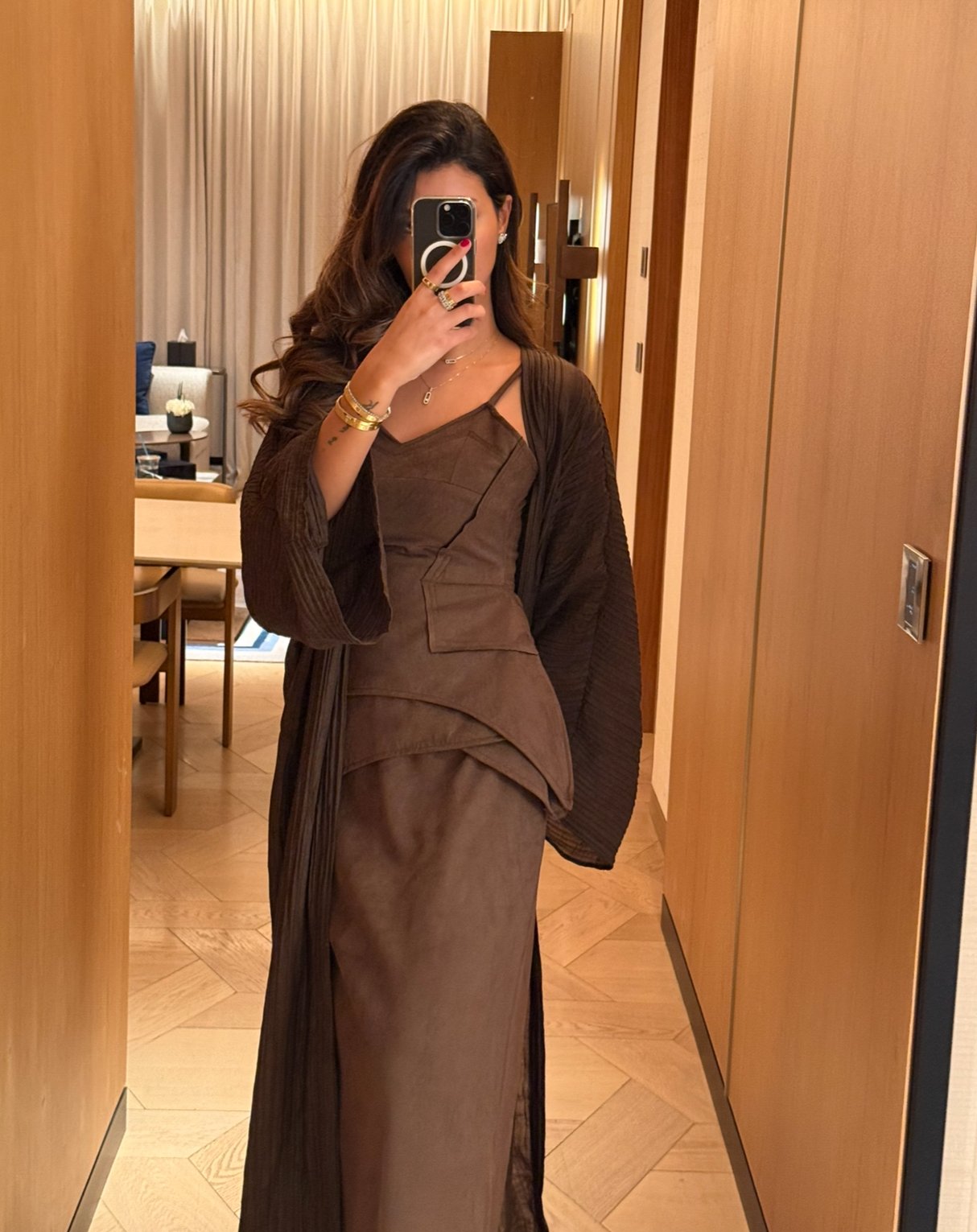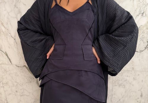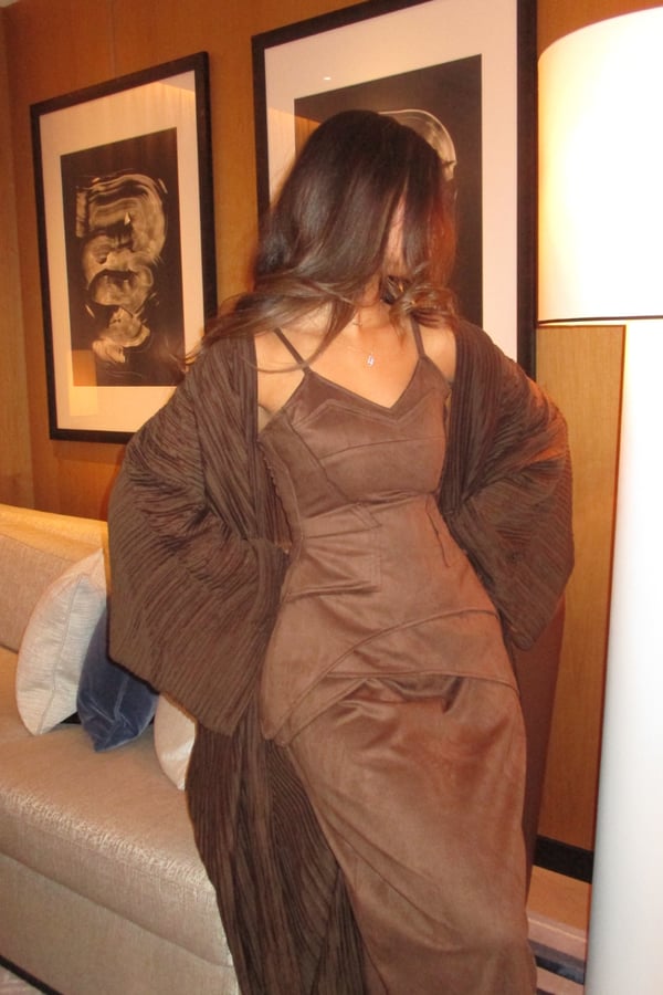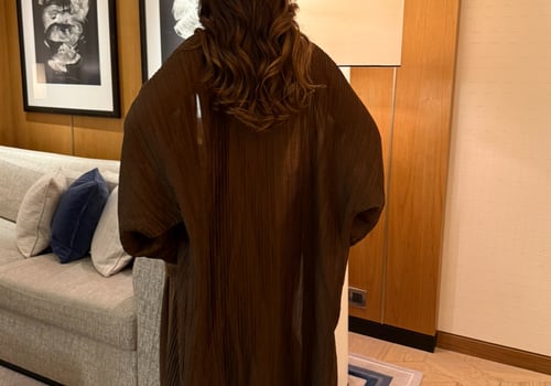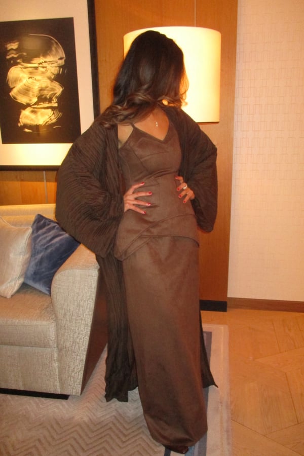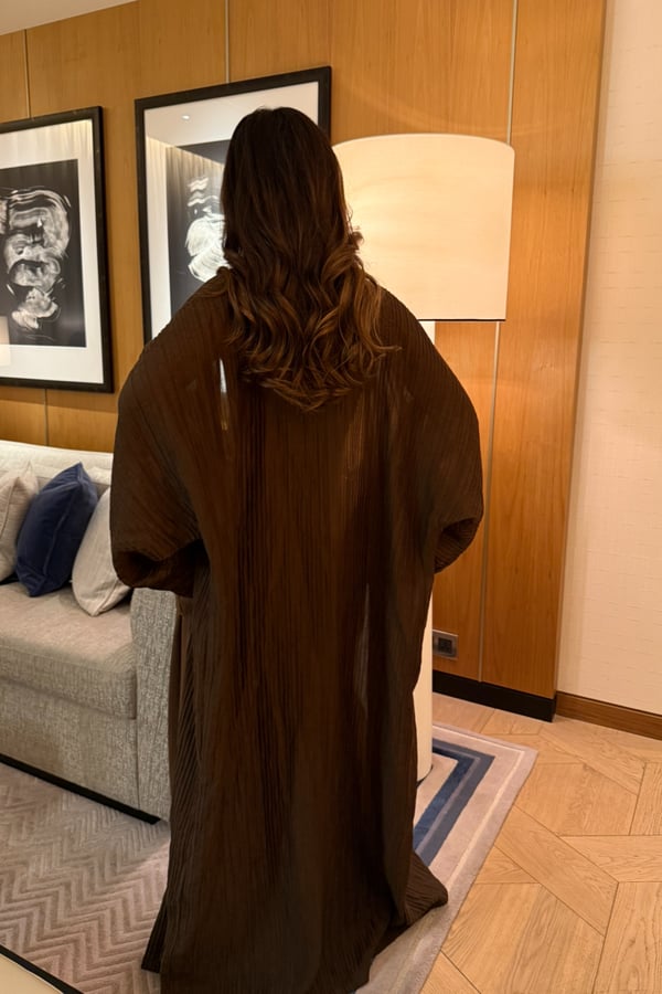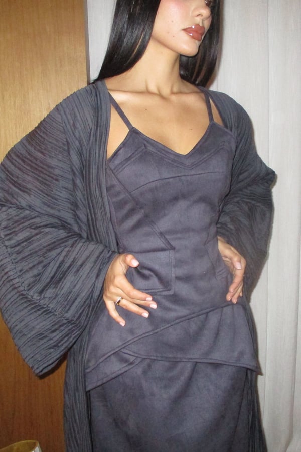 A luxurious three-piece set crafted from soft suede, featuring a structured top and straight skirt paired with a matching bisht. Designed to flatter the silhouette while offering effortless elegance, the lightweight bisht adds movement and a refined finish. pre order no return