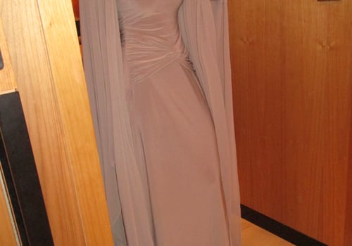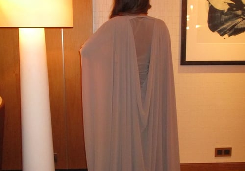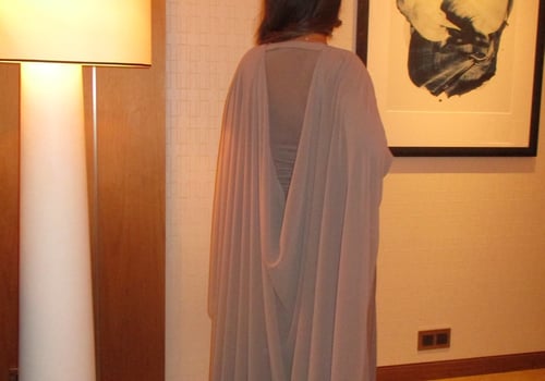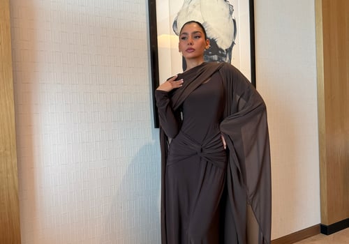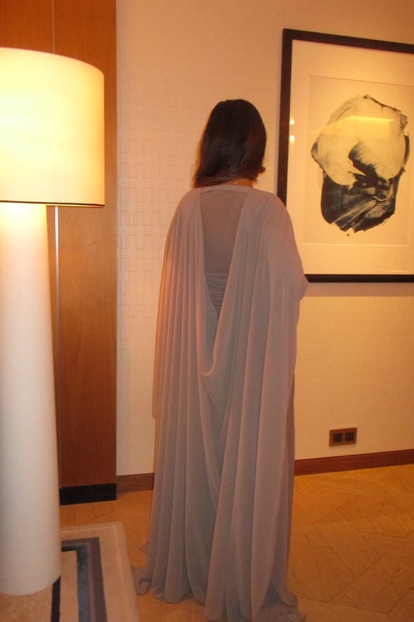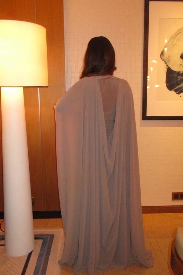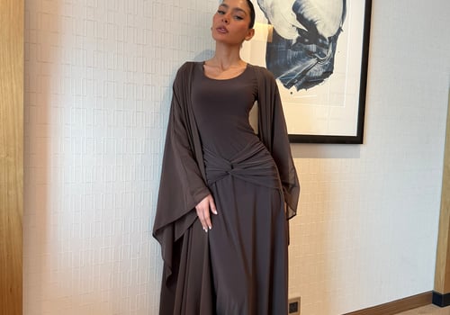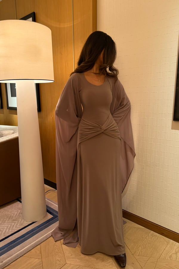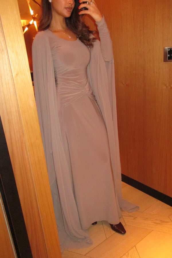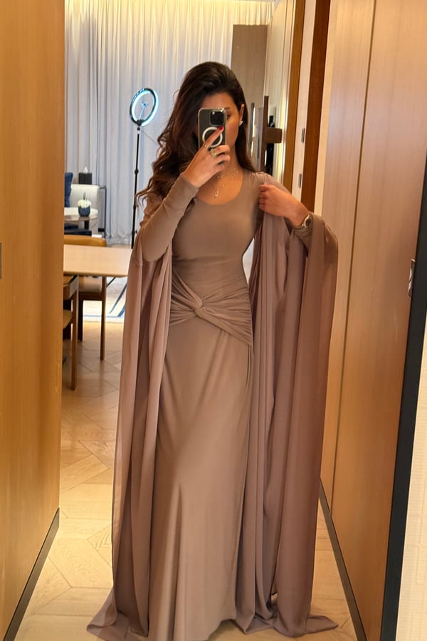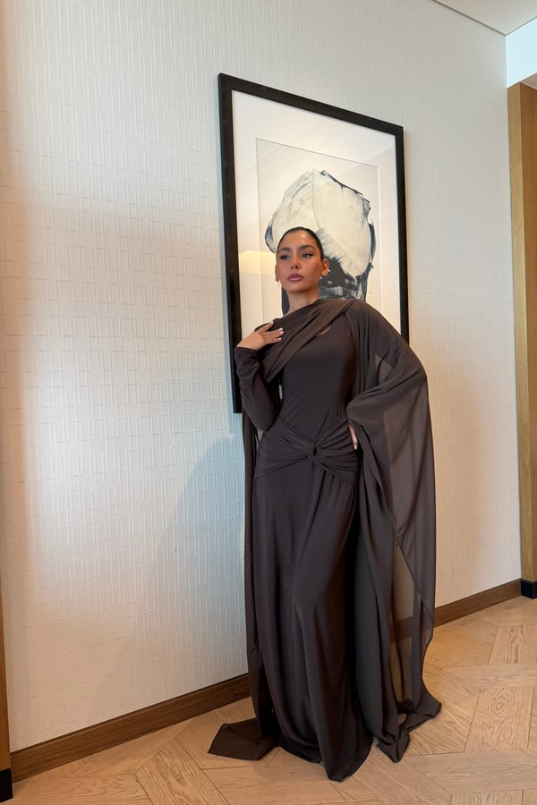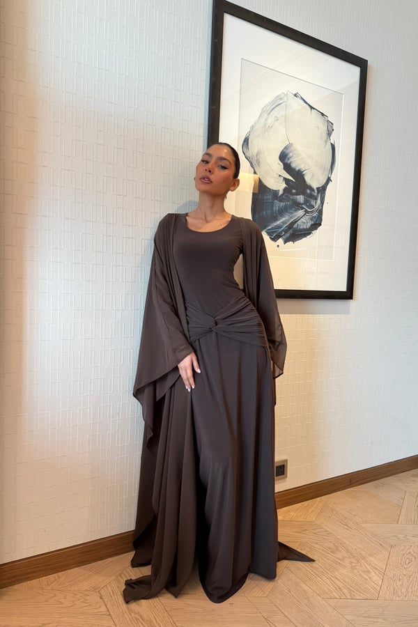 A refined two-piece set featuring a fitted dress designed with a ruched waistline that subtly shapes and flatters the silhouette. Paired with a lightweight chiffon bisht that drapes effortlessly, pre order no return