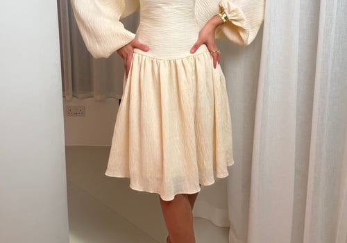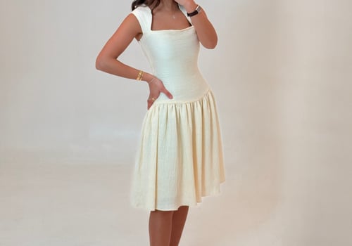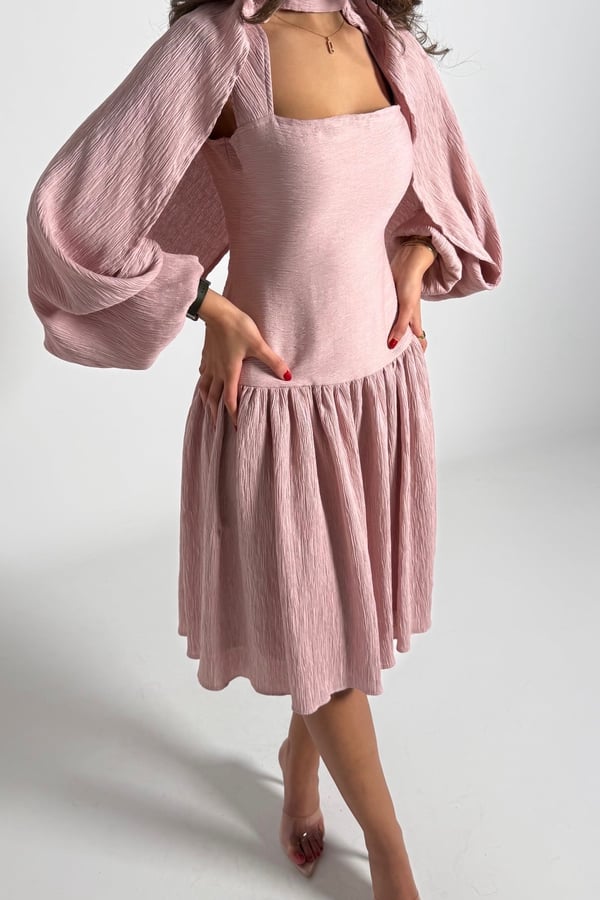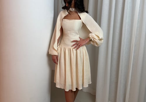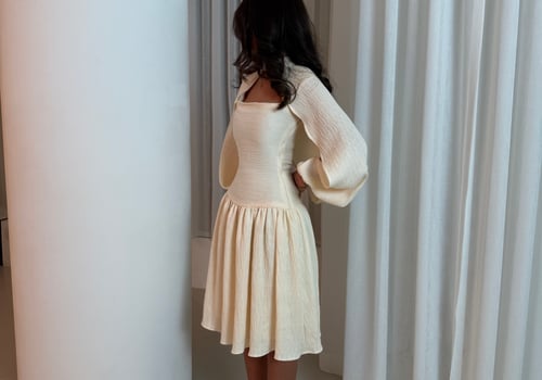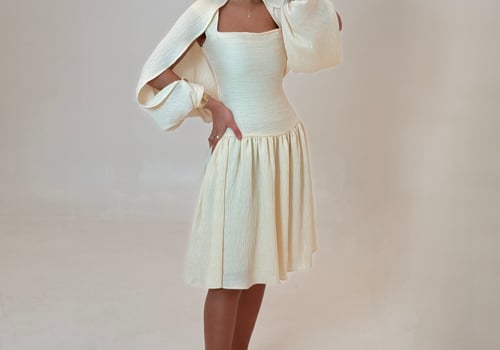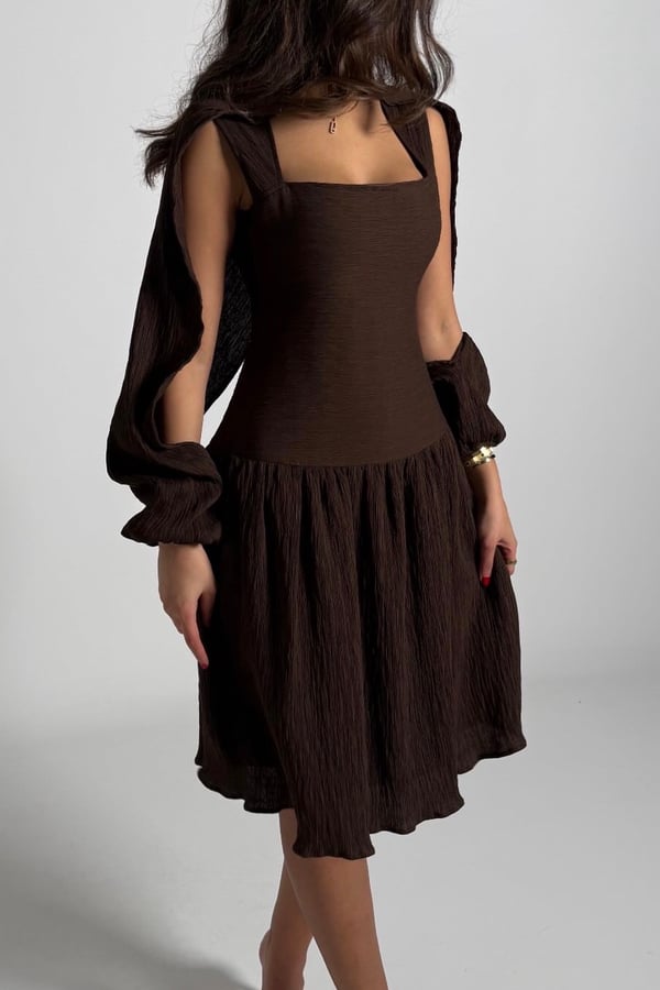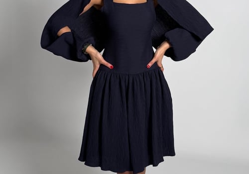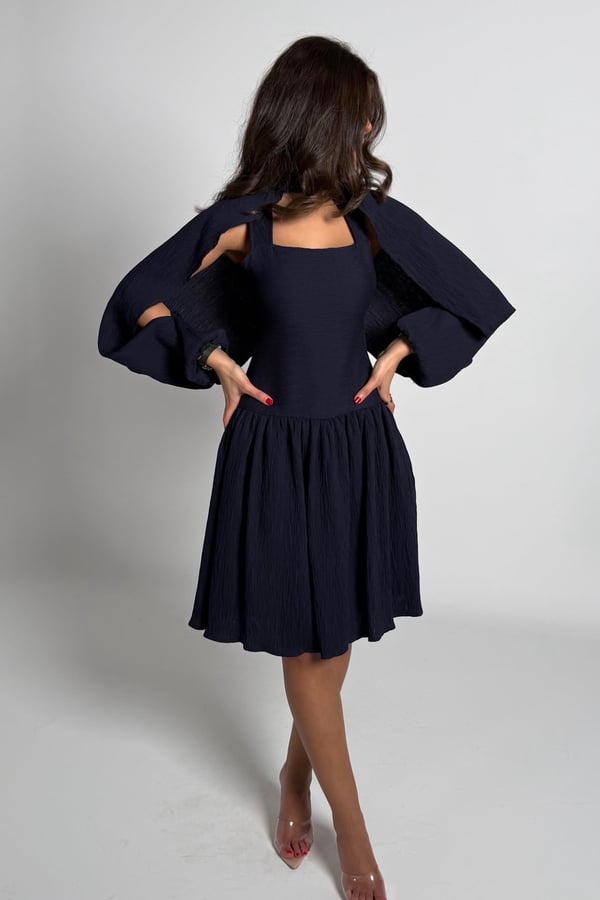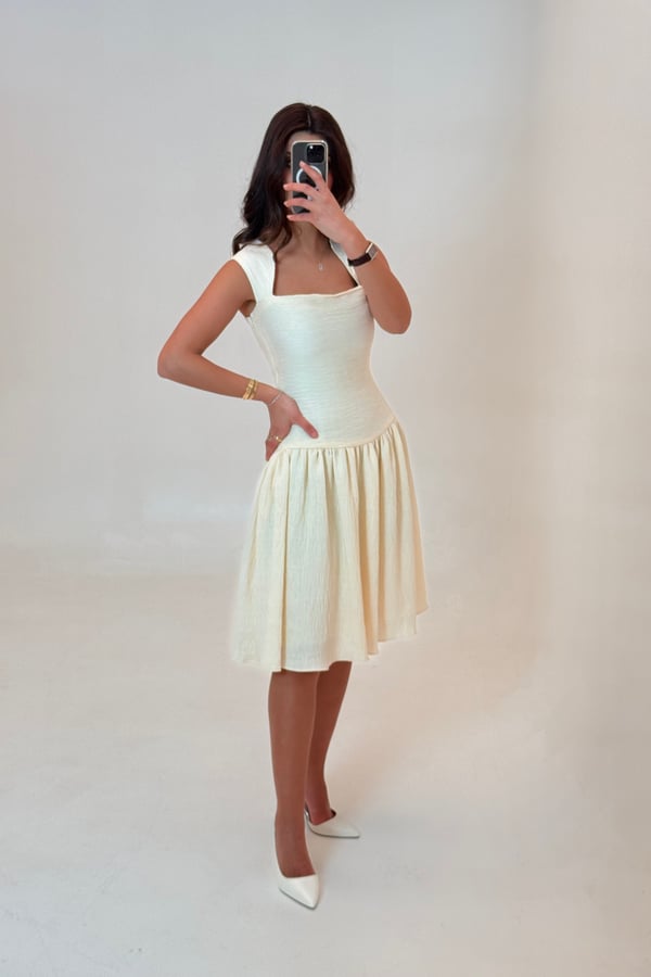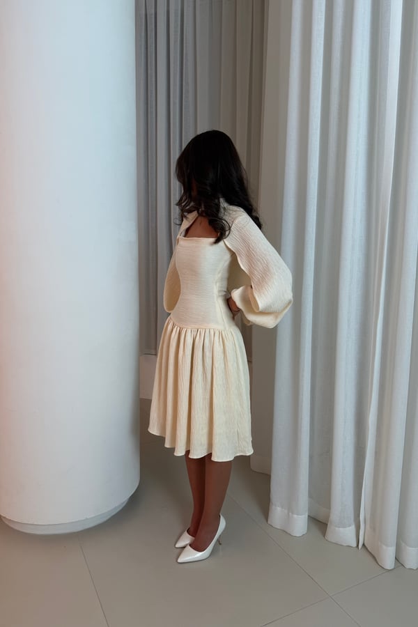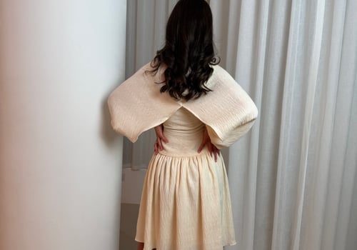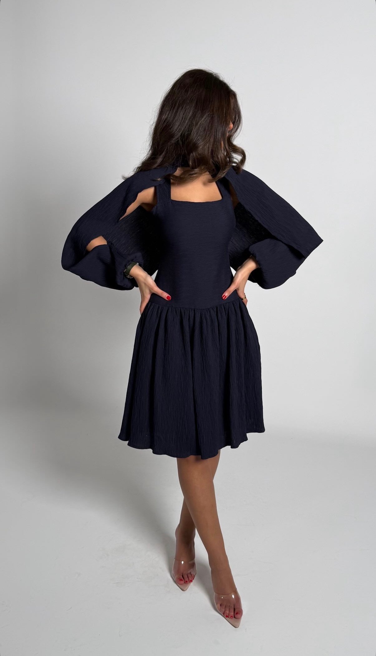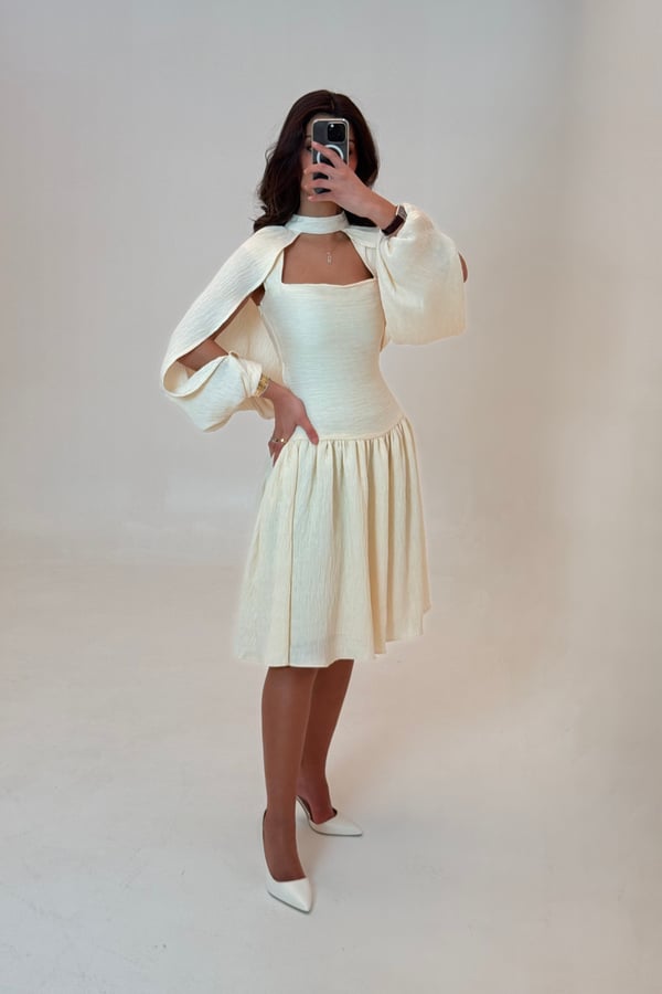 Soft pleated dress with a flowing cape detail. Knee length 39inches Pre-order only. length not adjustable. No returns or exchanges.
